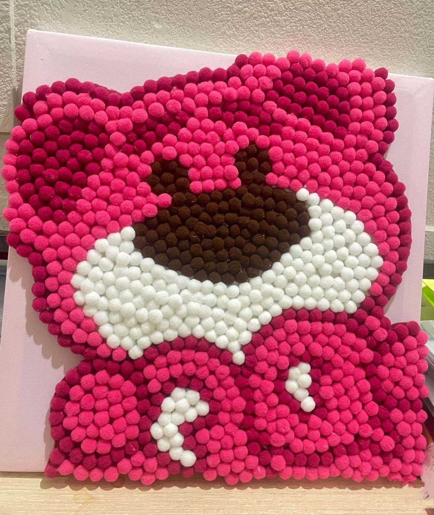 - Use tweezers to place the pompoms in the glue, starting with the edges and moving inward